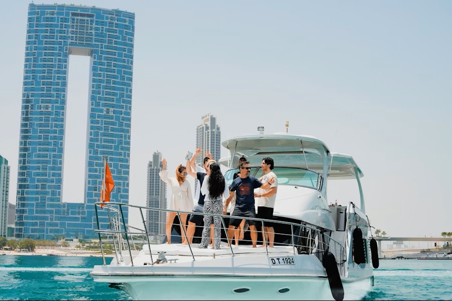 Enjoy a shared yacht cruise with panoramic views of Dubai’s skyline