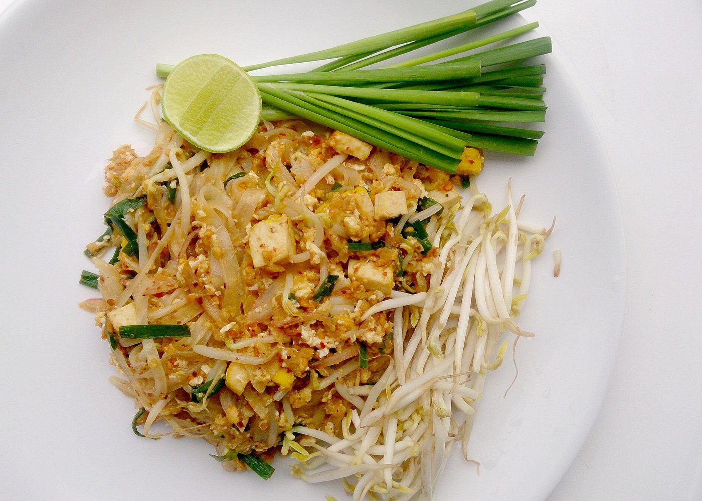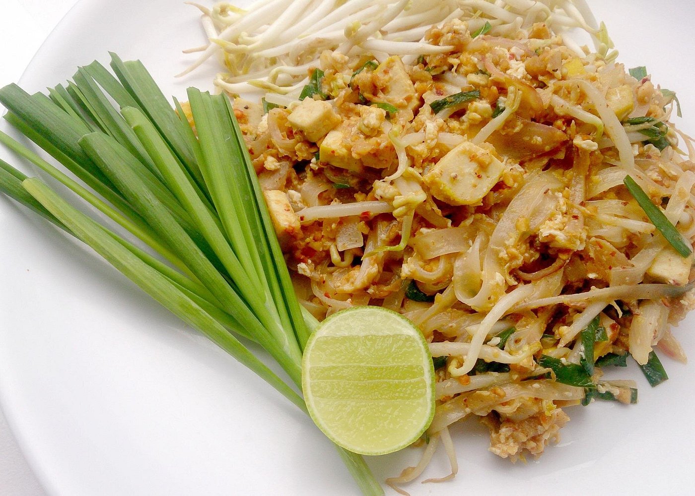 Pad Thai—prepared with rice noodles, tofu, bean sprouts, cilantro, and lime