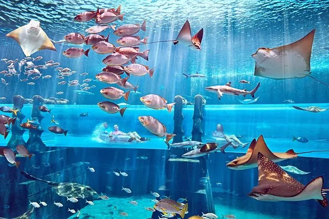Explore the Atlantis-themed aquarium, home to sharks, rays, and seahorses